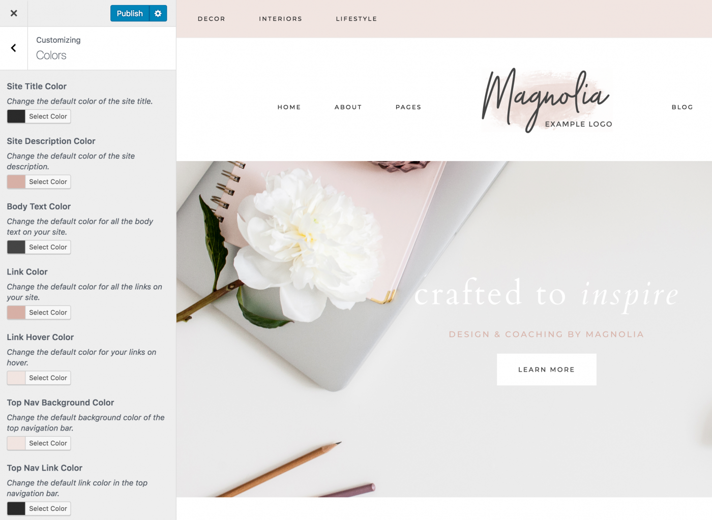 With the Magnolia theme, you can customize your site in real-time using the WordPress Customizer panel. This allows you to fine tune and tweak how your site looks before going live!